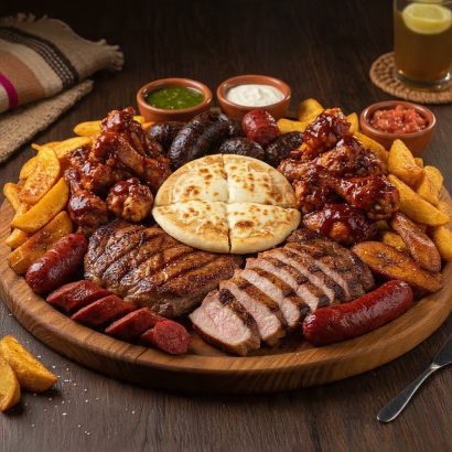 Disfruta una explosión de sabores con carne de cerdo jugosa (220 g), alitas BBQ (300 g), chorizo, morcilla, arepa gratinada, maduritos, papa criolla y nuestras salsas artesanales. Perfecta para compartir.
