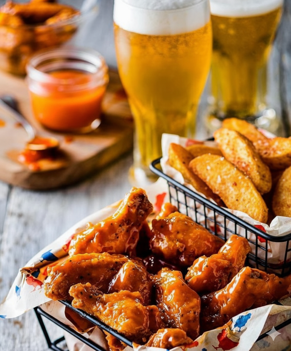 600gr de alitas jugosas y bañadas en nuestra irresistible salsa bbq o miel mostaza acompañadas de papas en casco.