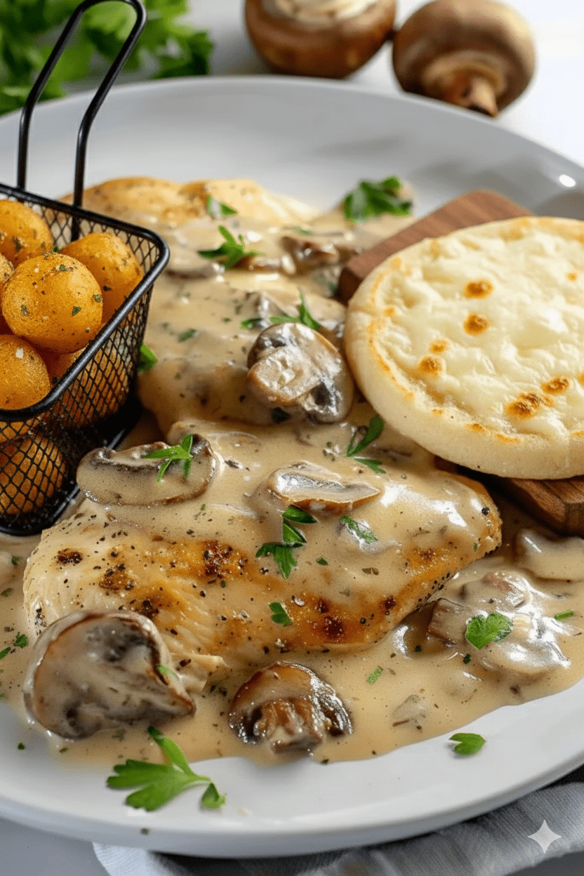 270Gr de pechuga en salsa de champiñones, acompañado de papa criolla y/o casco, arepa gratinada.